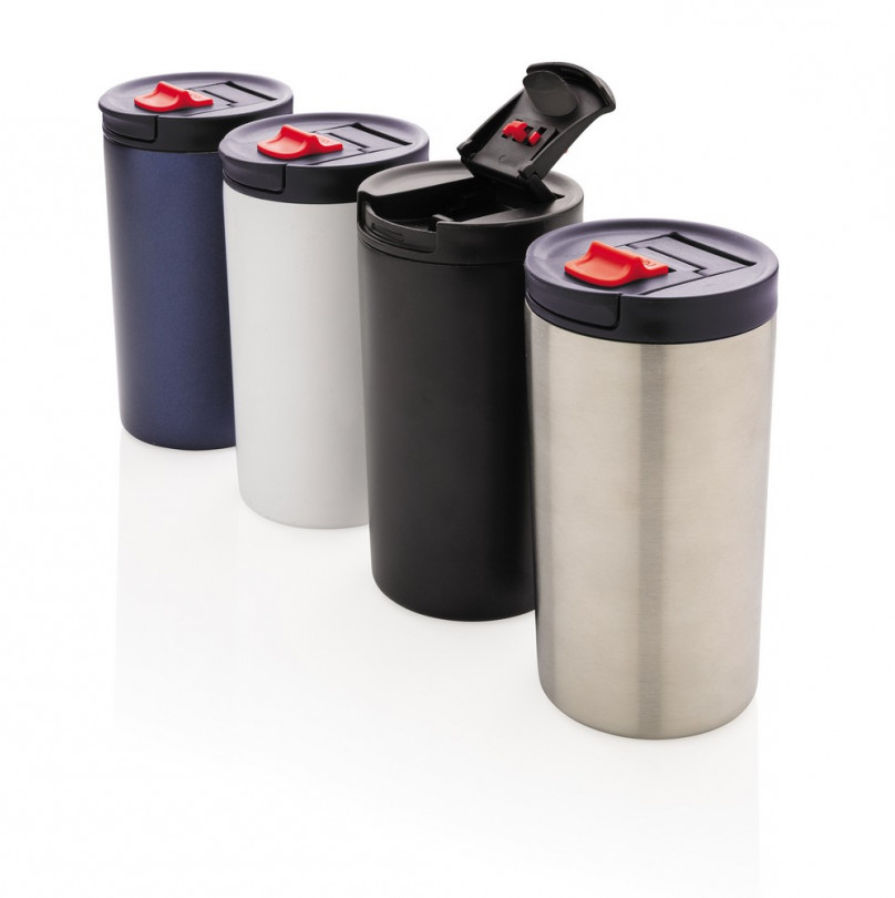 Kubek termiczny z nadrukiem 450 ml, niebieski kolor, podwójne ścianki z próżnią między ściankami, utrzymuje temperaturę napojów ciepłych do 5 godzin oraz zimnych do 15 godzin, szczelne wieczko, nie wymaga obsługi oburącz, nie zawiera BPA