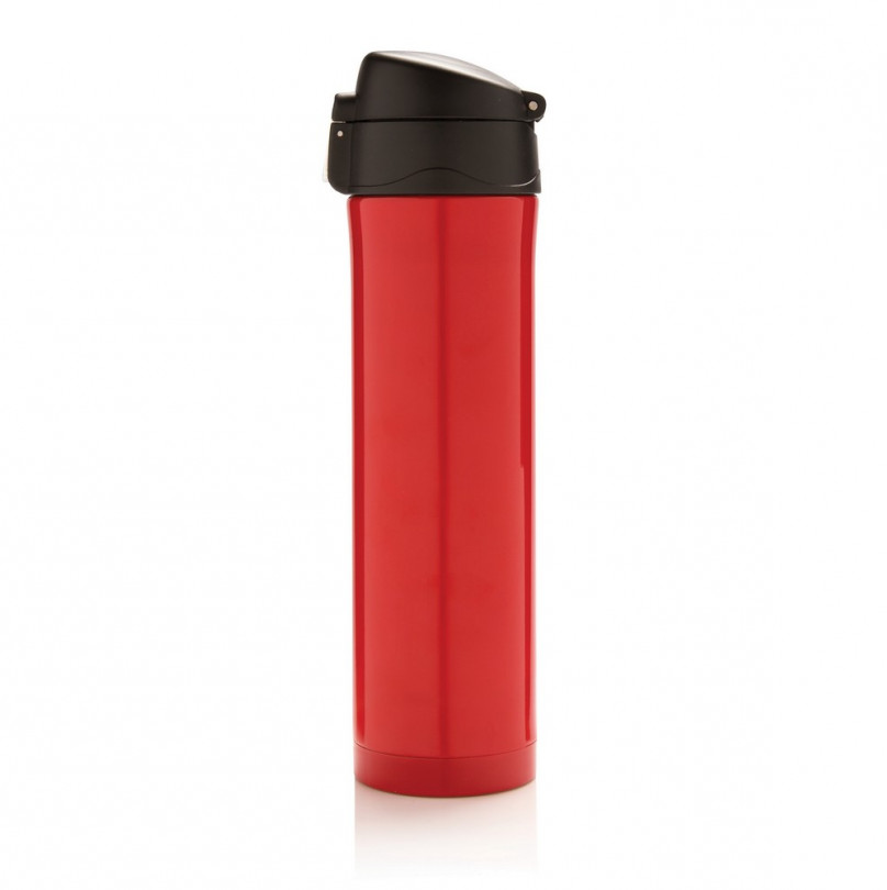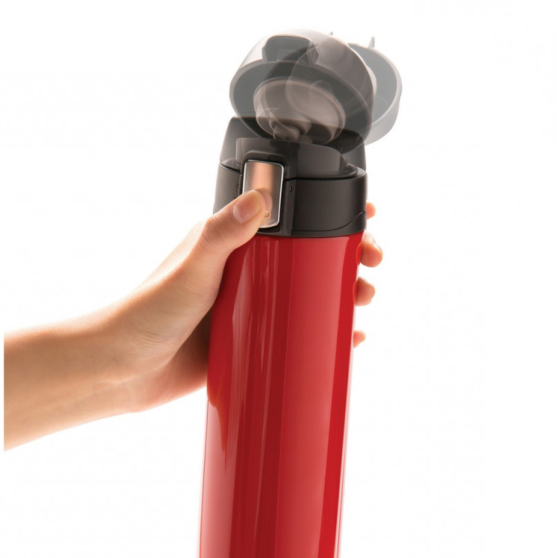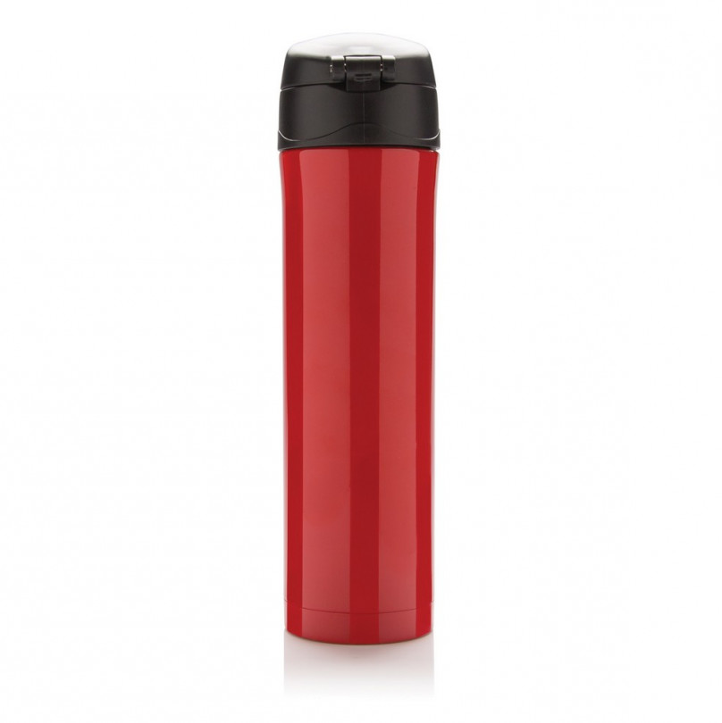 Czerwony kubek termiczny z własnym nadrukiem, pojemność 450 ml ze stali nierdzewnej, podwójne ścianki, utrzymuje temperaturę napojów ciepłych do 5 godzin oraz zimnych do 15 godzin, pokrywa z blokadą chroniącą przed wylaniem lub przeciekaniem napoju, można ją myć w zmywarce, nie wymaga obsługi oburącz, pasuje do każdego uchwytu samochodowego