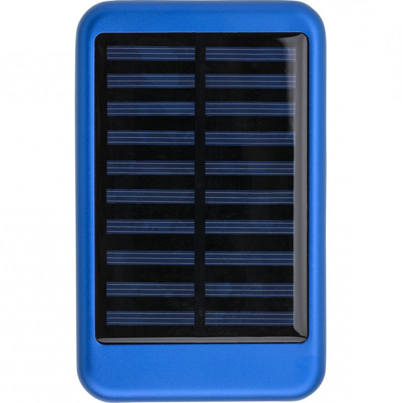 Kod towaru: MSP045XPLNiebieski power bank z opcją nadruku logo. Pojemność baterii 4000 mAh, Naładować akumulator można dzięki panelu słonecznemu.